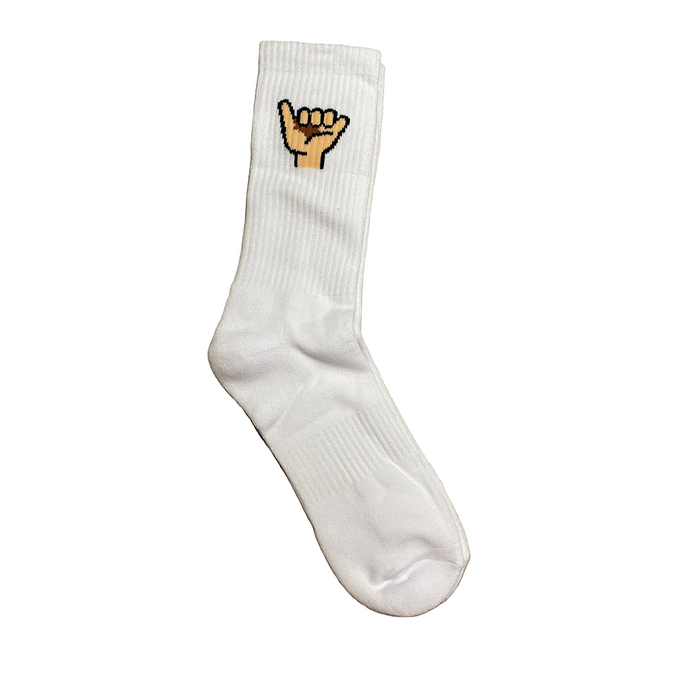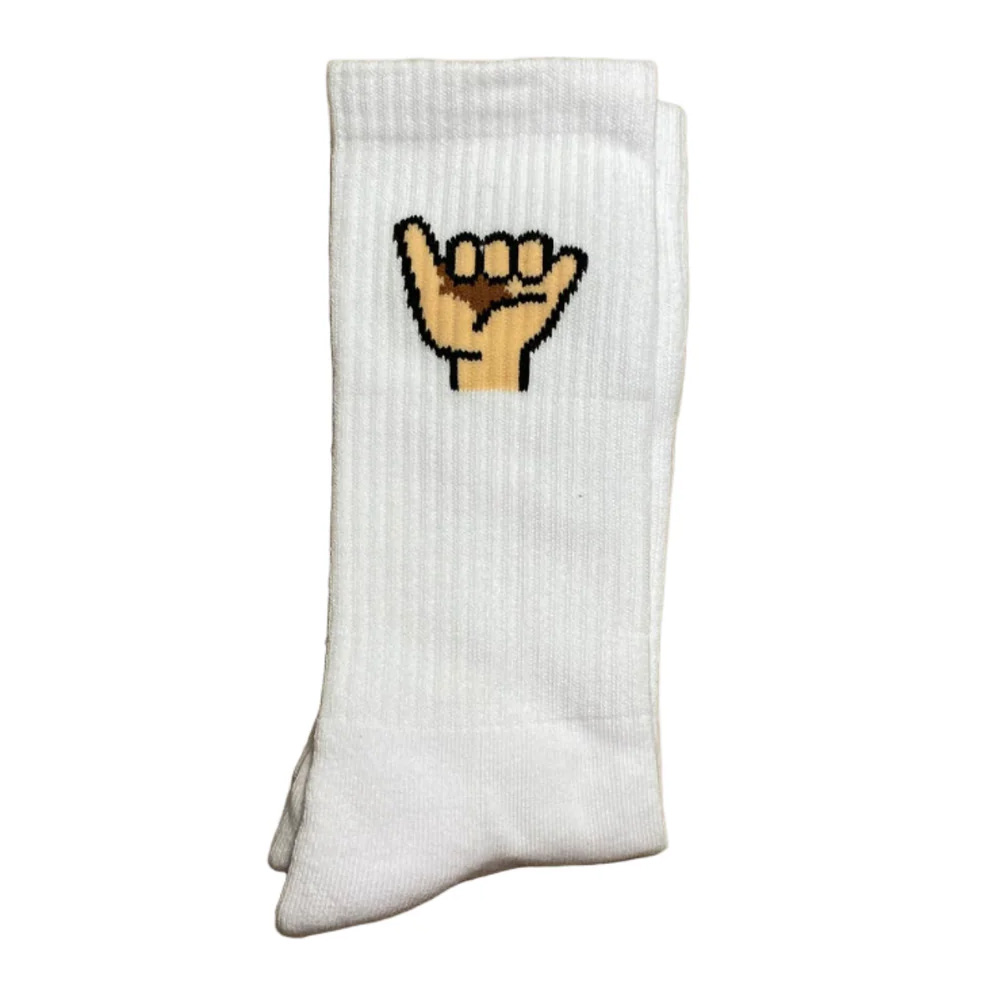Check det fede shaka-tegn, der sidder som et lille stykke aloha-spirit på sokken. Det er DET klassiske hawaiianske symbol for chill vibes, good energy og "hey, livet er for kort til dårligt humør". Designet er simpelt, clean og ultra catchy – perfekt til dig der ikke går efter basic, men heller ikke vil have alt for meget larm på fødderne. Just the right amount of statement.
